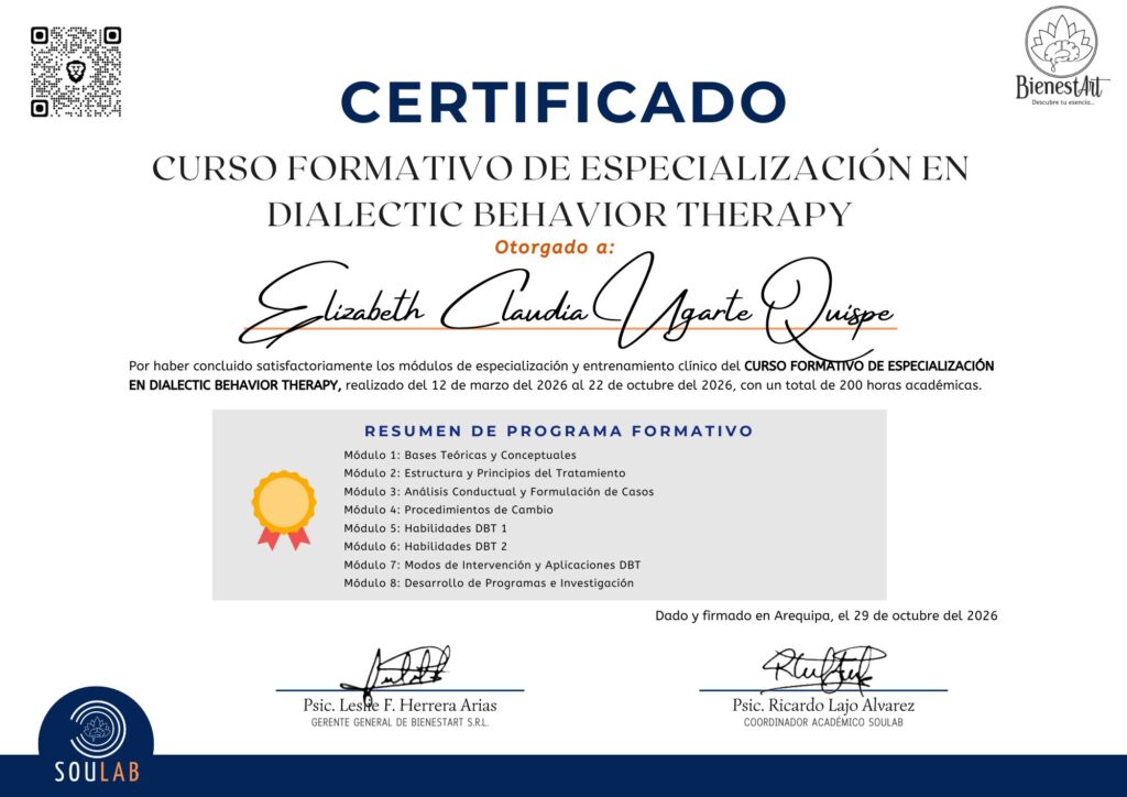 Formación clínica especializada en Dialectic Behavior Therapy (DBT), con enfoque basado en evidencia y alta aplicabilidad profesional.