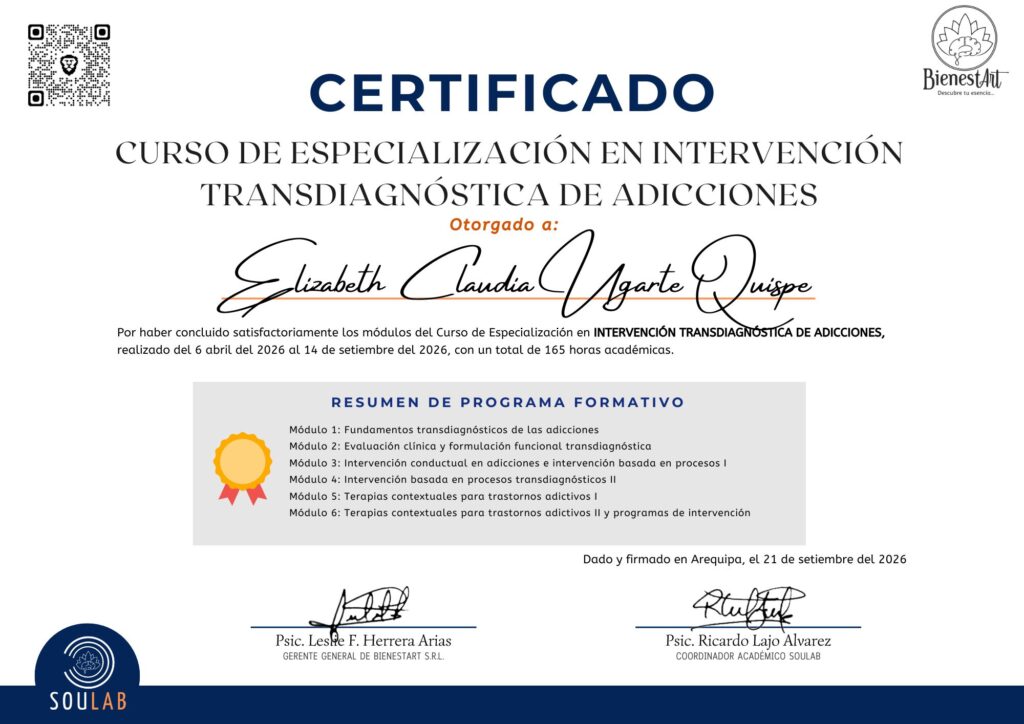 Al finalizar el curso y cumplir con los criterios académicos establecidos, se otorga una certificación privada de formación especializada emitida por SOULAB – Formación Especializada para Psicólogos.